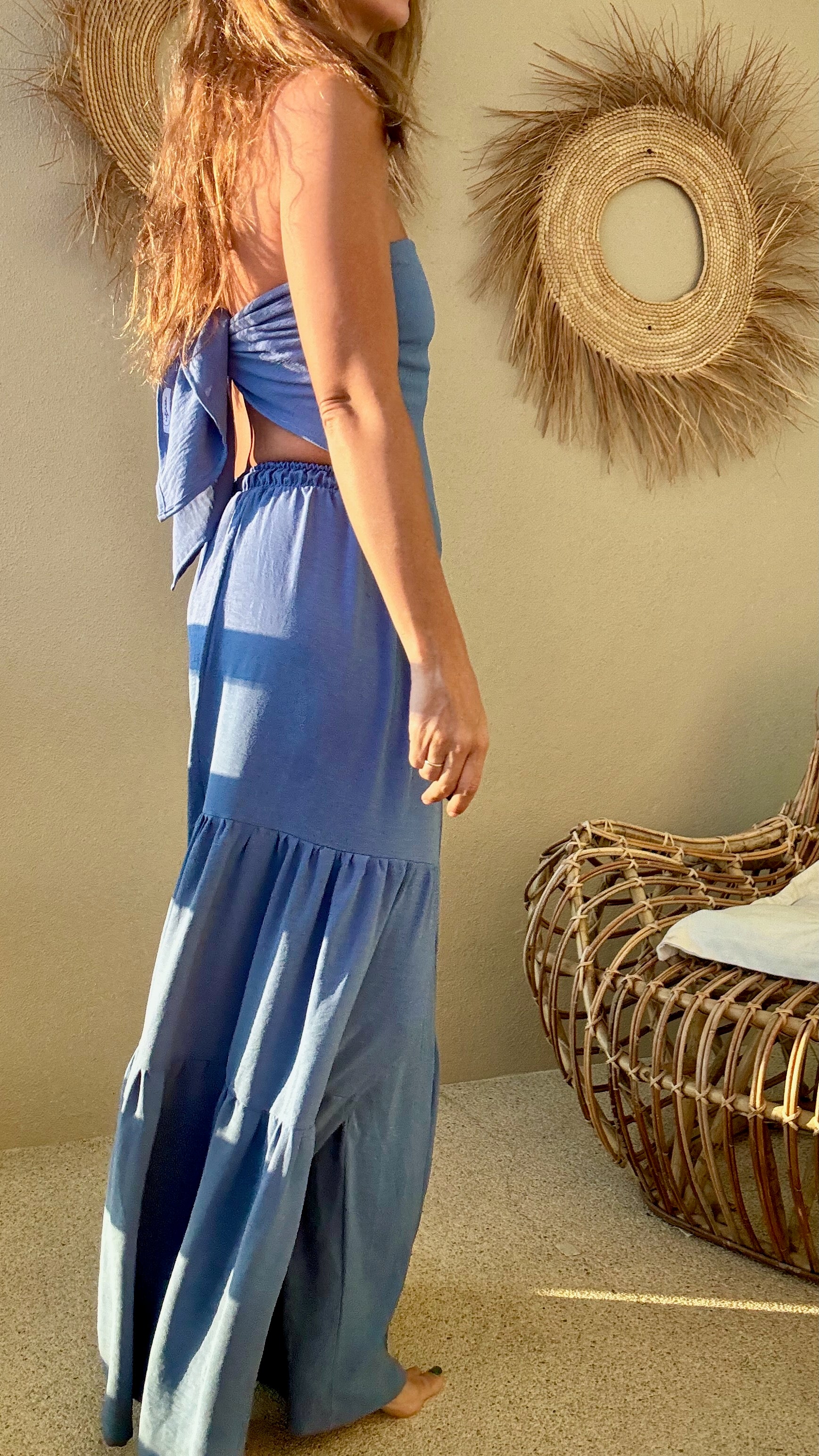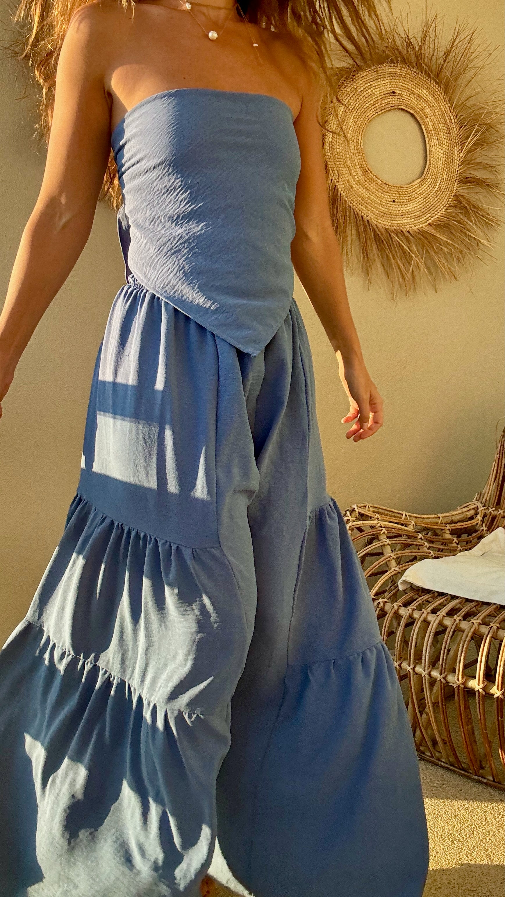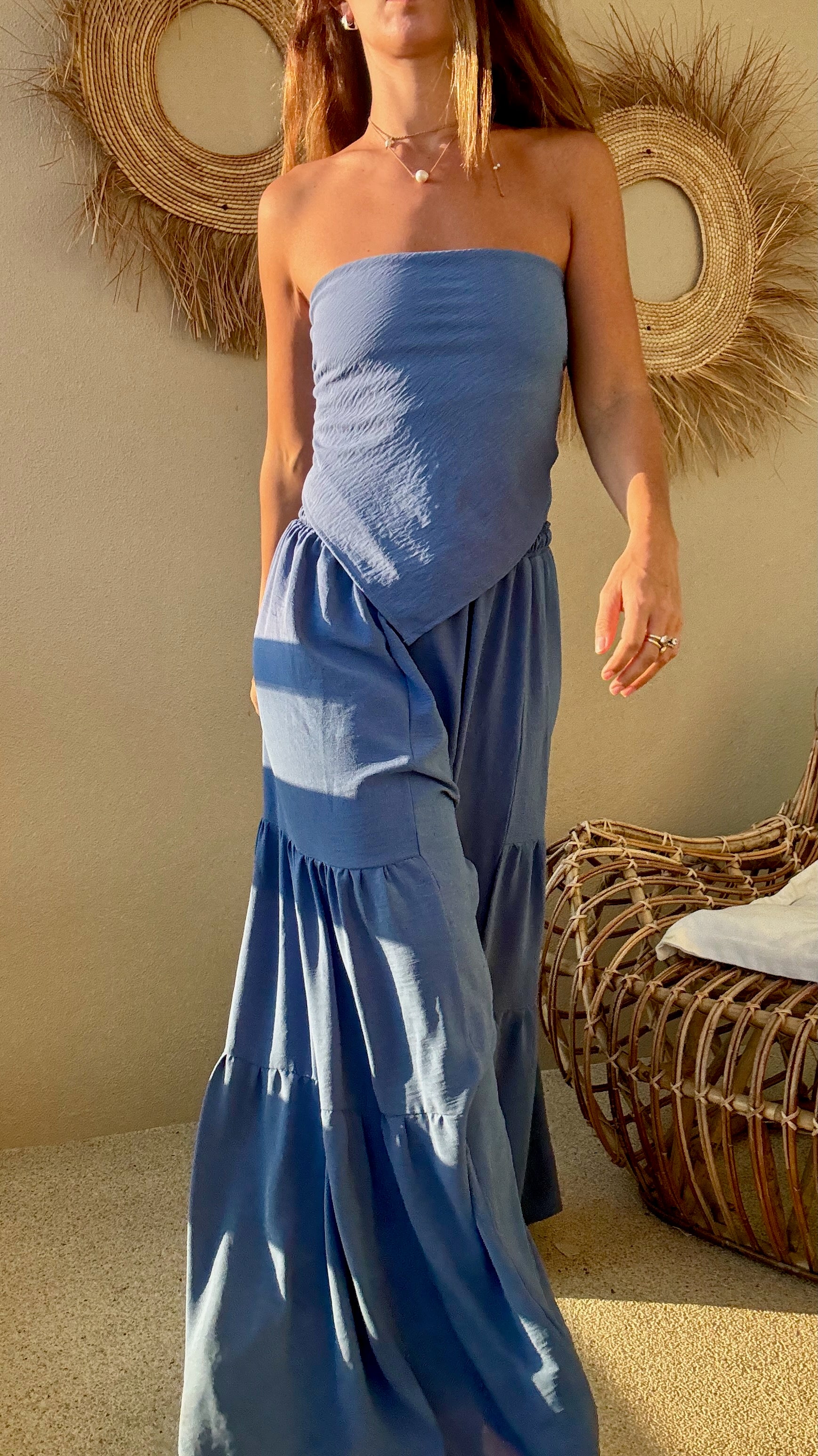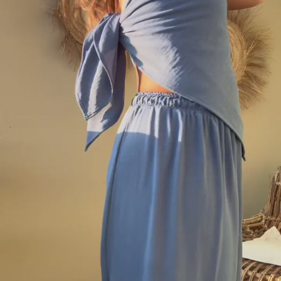 Pantalón de silueta amplia con resorte ajustable en la cintura, pensado para adaptarse cómodamente al cuerpo sin marcar. Su tela no se arruga fácilmente y es ligera lo que le da movimiento y es ideal para climas cálidos. Es una pieza versátil que puedes llevar con top, blusa o sobre traje de baño, de día o al atardecer.